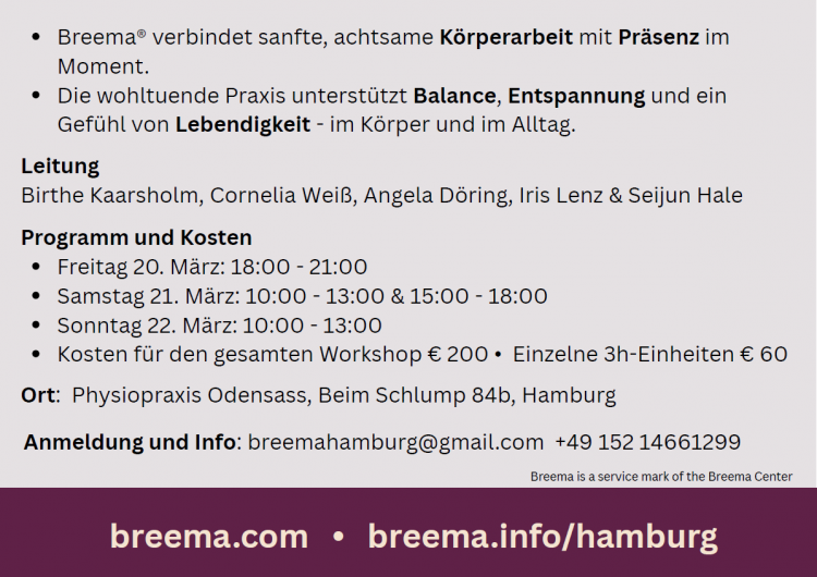 Breema-Wochenende in Hamburg Der Wochenend-Workshop beinhaltet eine experimentelle Erkundung der Neun Prinzipien der Harmonie und wie sie in jeder Aktivität oder Situation angewendet werden können. Wir werden mit Breema-Körperarbeit und Selbst-Breema-Übungen arbeiten, um einen empfänglicheren Geist, unterstützende Gefühle und einen vitalen Körper zu erfahren.