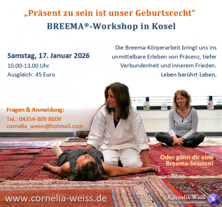 „Präsent zu sein ist unser Geburtsrecht“ Gemeinsam tauchen wir ein in die Einfachheit und Klarheit der Breema-Körperarbeit, kommen in die Präsenz und lassen uns von den absichtslosen Berührungen und der Erfahrung von Nähe und Verbundenheit tragen und nähren. |