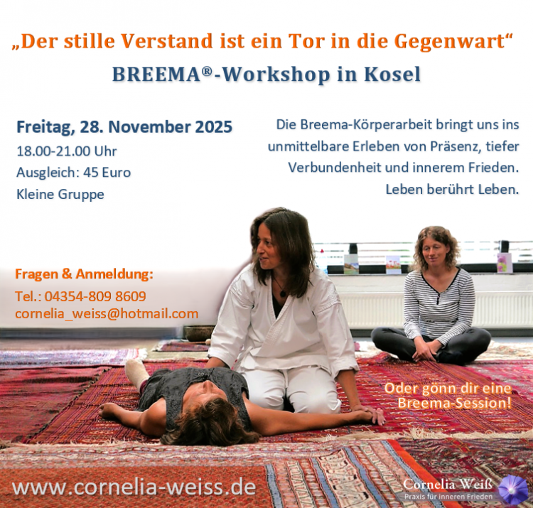 „Der stille Verstand ist ein Tor in die Gegenwart“ Gemeinsam tauchen wir ein in die Einfachheit und Klarheit der Breema-Körperarbeit, kommen in die Präsenz und lassen uns von den absichtslosen Berührungen und der Erfahrung von Nähe und Verbundenheit tragen und nähren. (45 €, ggf. Preisnachlass nach Selbsteinschätzung) |